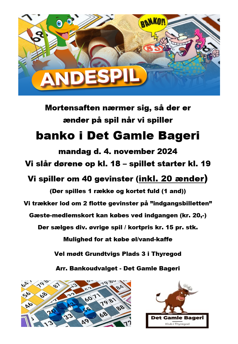 3 nov 2025 Mandag, 19.00 Andespil i DGB - november Dørene åbner kl. 18:00. Der spilles om 40 gevinster. Se invitation med praktiske detaljer, her! Andespil November2025