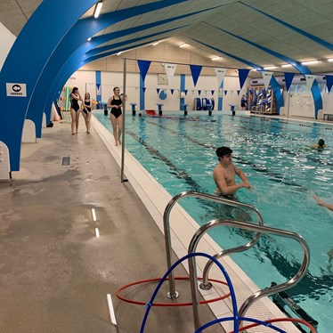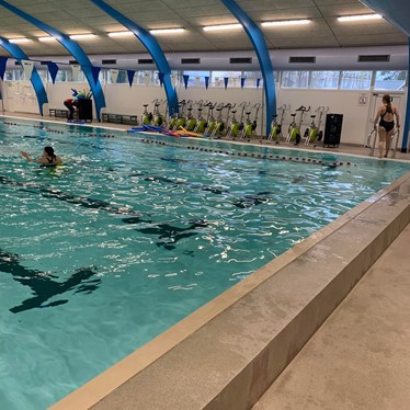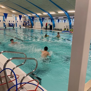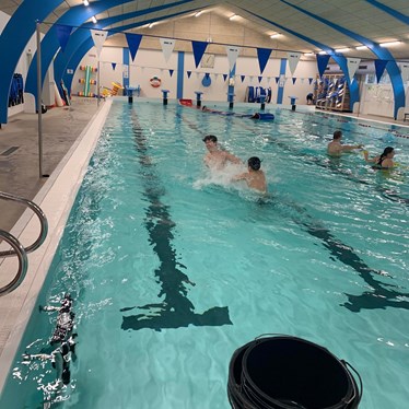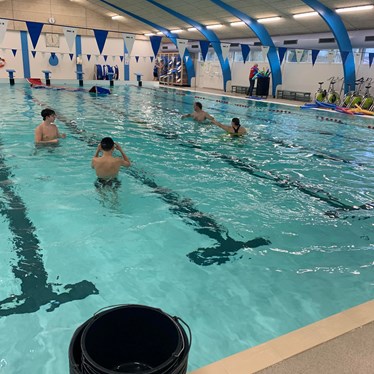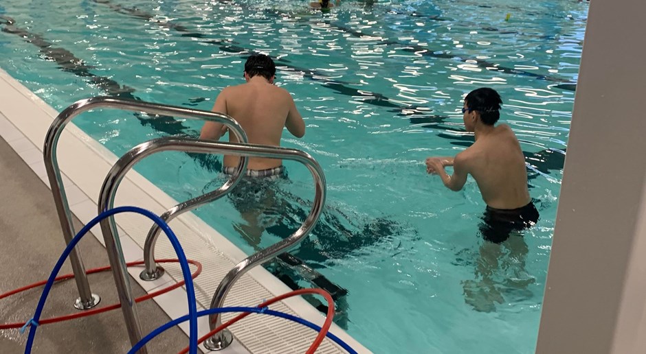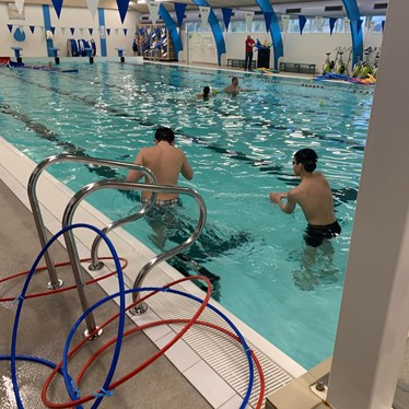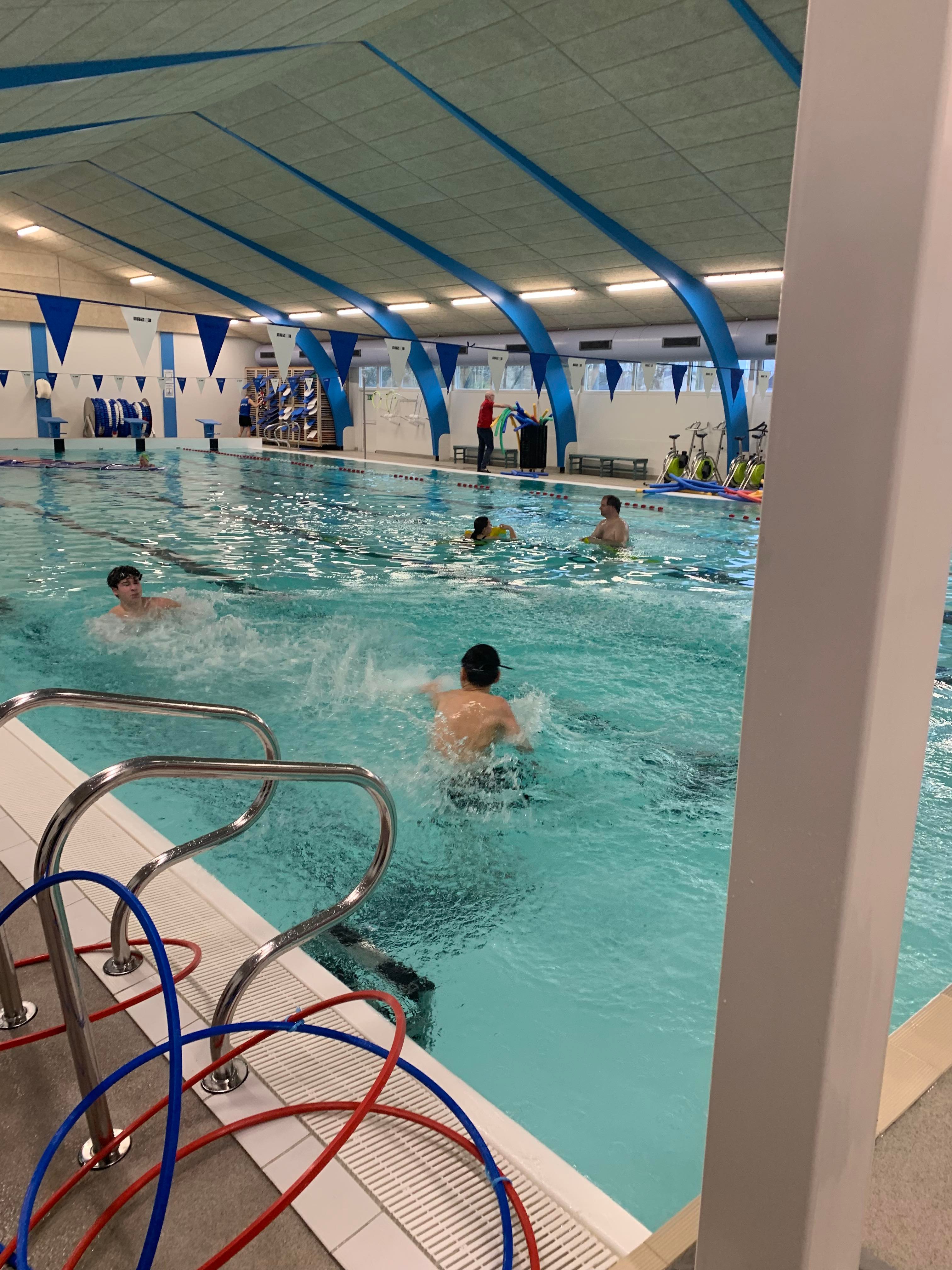 Vi lagde ud med lidt opvarmning i svømmehallen og efterfølgende stod den på gejl og gøgl i bassinet. Inden vi hoppede op, tog vi en tur i det varme vand.